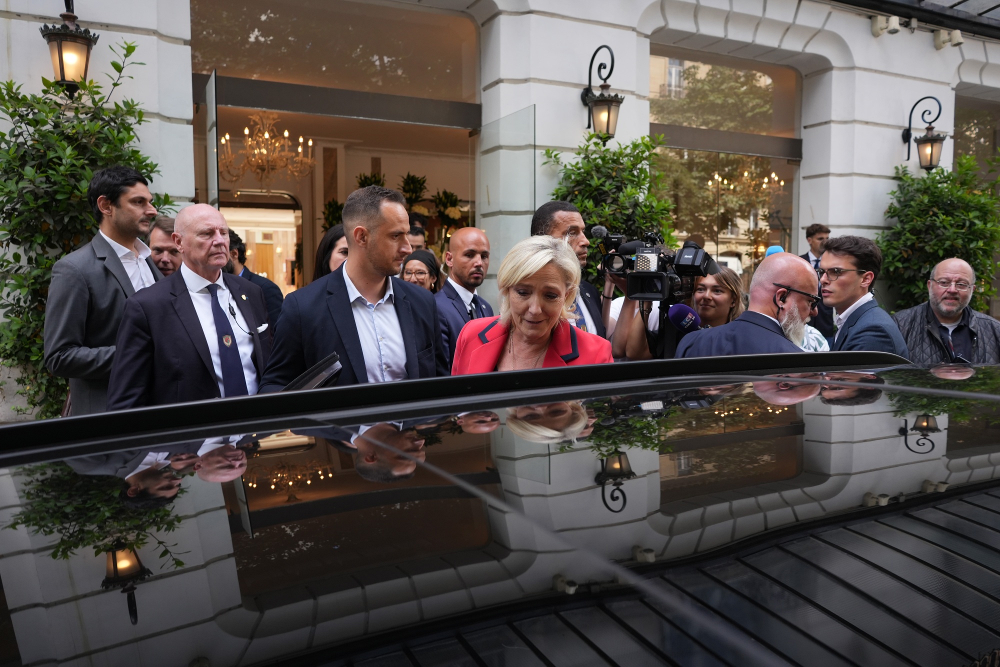 玛丽娜·勒庞,中间,离开参加新闻发布会后,法国巴黎,6月24日。