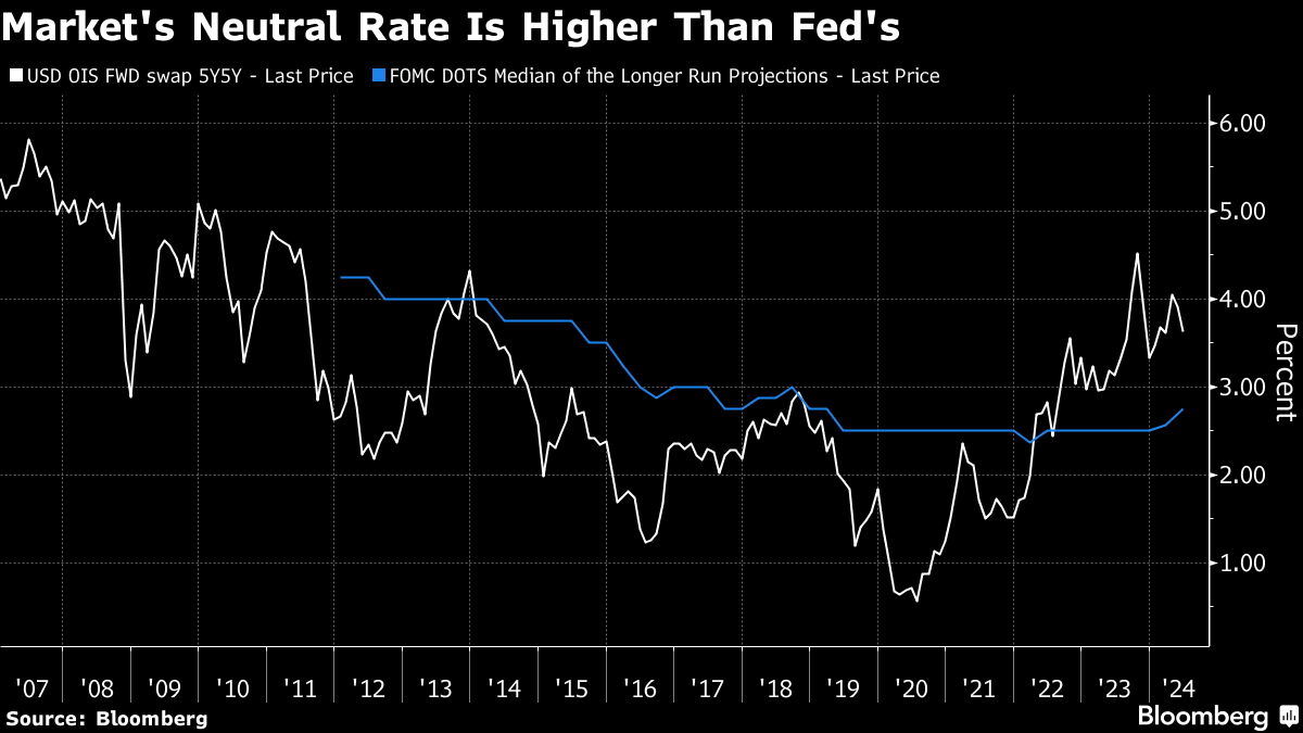 但另一方面,市场似乎估计所谓的中性利率 - 一个既不刺激也不拖累增长的理论水平 - 比美国央行官员最新季度预测报告中的水平高得多。