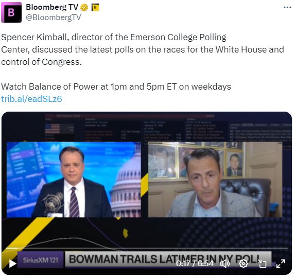 今天在彭博电视台的权力平衡早间版节目中,主持人乔·马修和凯莉·莱因兹采访了爱默生学院民意调查中心主任斯宾塞·金博尔,谈论了总统竞选和国会竞选的最新数据。