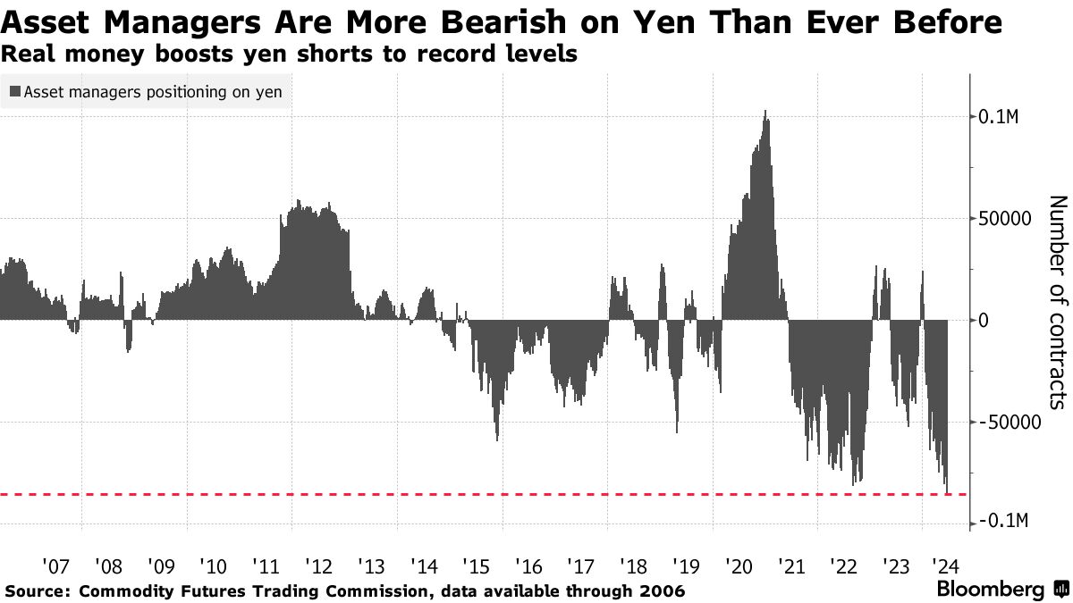 资产管理人员也持悲观态度。根据周一发布的商品期货交易委员会数据,截至6月18日的一周内,他们加大了对日元的空头押注,创下自2006年以来的最悲观持仓,对冲基金也增加了对日元的空头押注,保持在近期记录附近,数据显示。