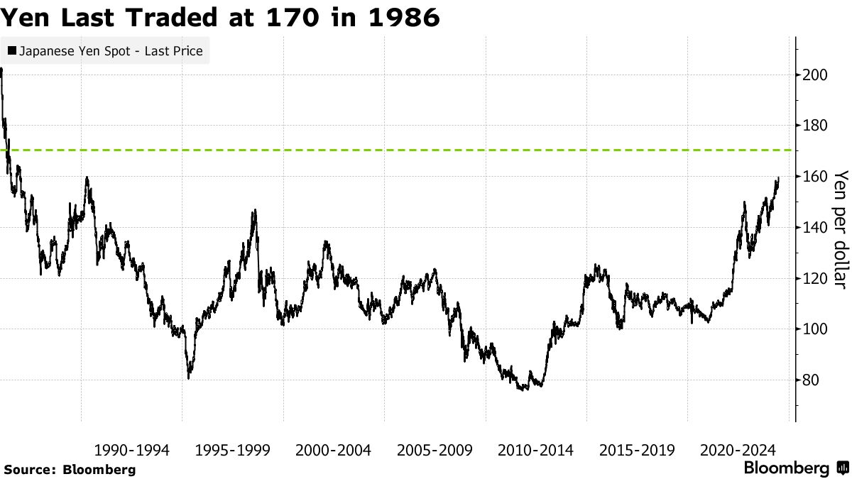 USD/JPY:日元可能下跌至170水平,这是自1986年以来最低水平-彭博社