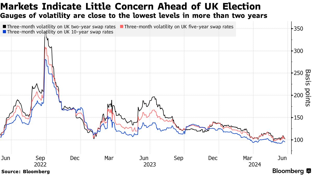 莫比的观点与大多数债券投资者相悖,后者押注于前首相利兹·特拉斯两年前未经资金支持的减税所引发的动荡记忆将阻止反对党工党过度支出,而工党在民意调查中领先幅度很大。英国债券波动率指数接近两年来的最低水平。