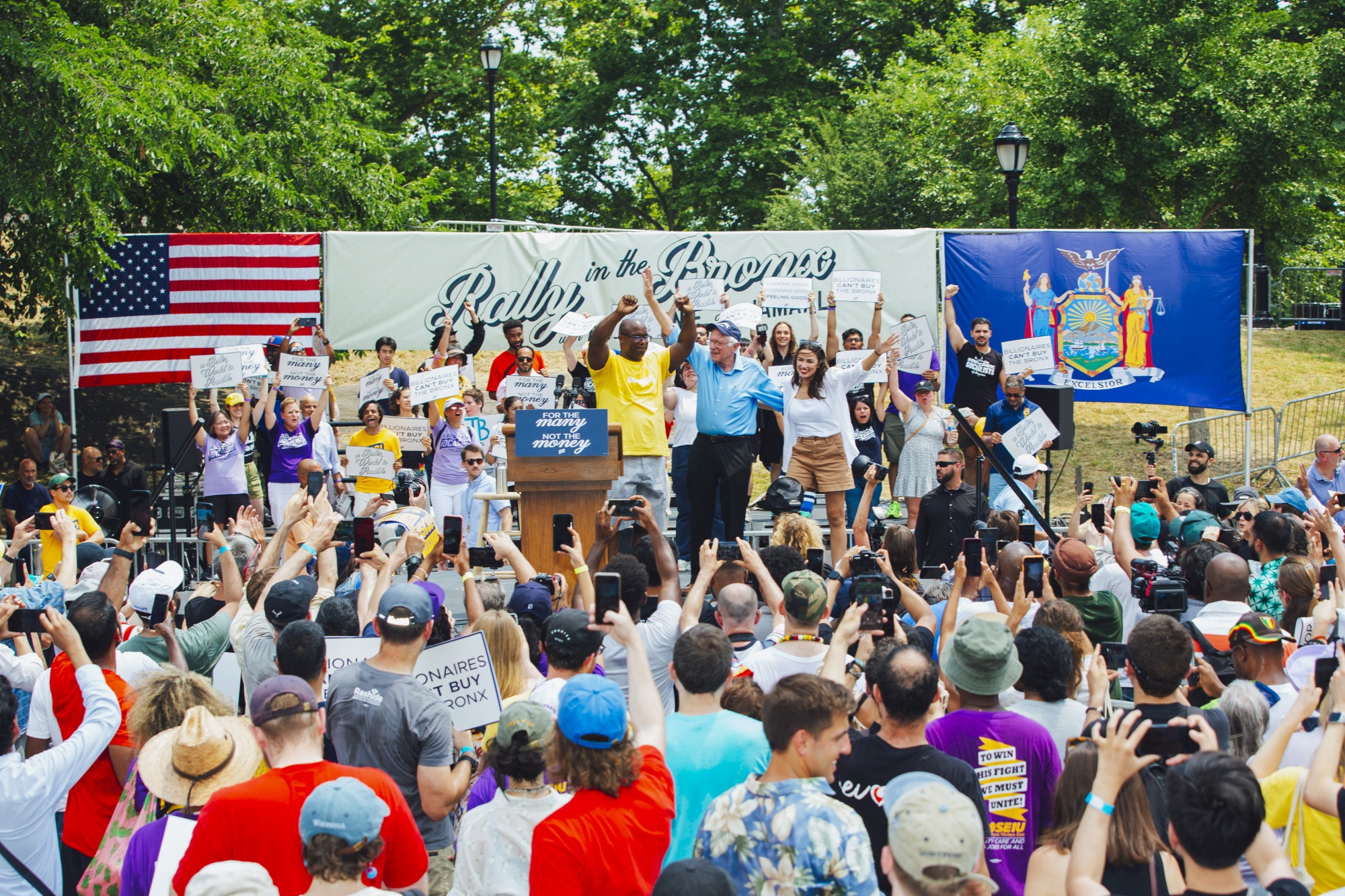 中左派代表贾马尔·鲍曼、参议员伯尼·桑德斯和众议员亚历山德里亚·奥卡西奥-科尔特斯,在6月22日纽约布朗克斯区的一次GOTV集会上。摄影师:萨拉·康拉迪/彭博社### 在竞选途中