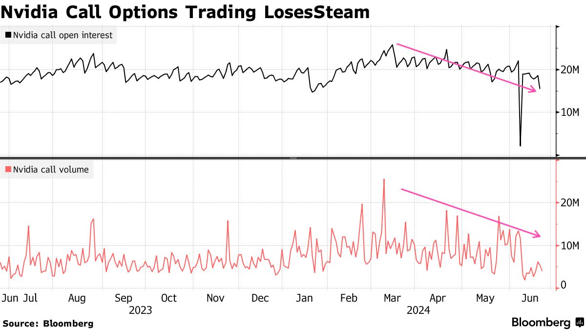 随着股价下跌,这种压力可能正在减轻。根据彭博社编制的数据显示,自上周五到期以来,看涨的Nvidia合约数量减少了四分之一,周一的认购交易量是20天平均水平的一半。