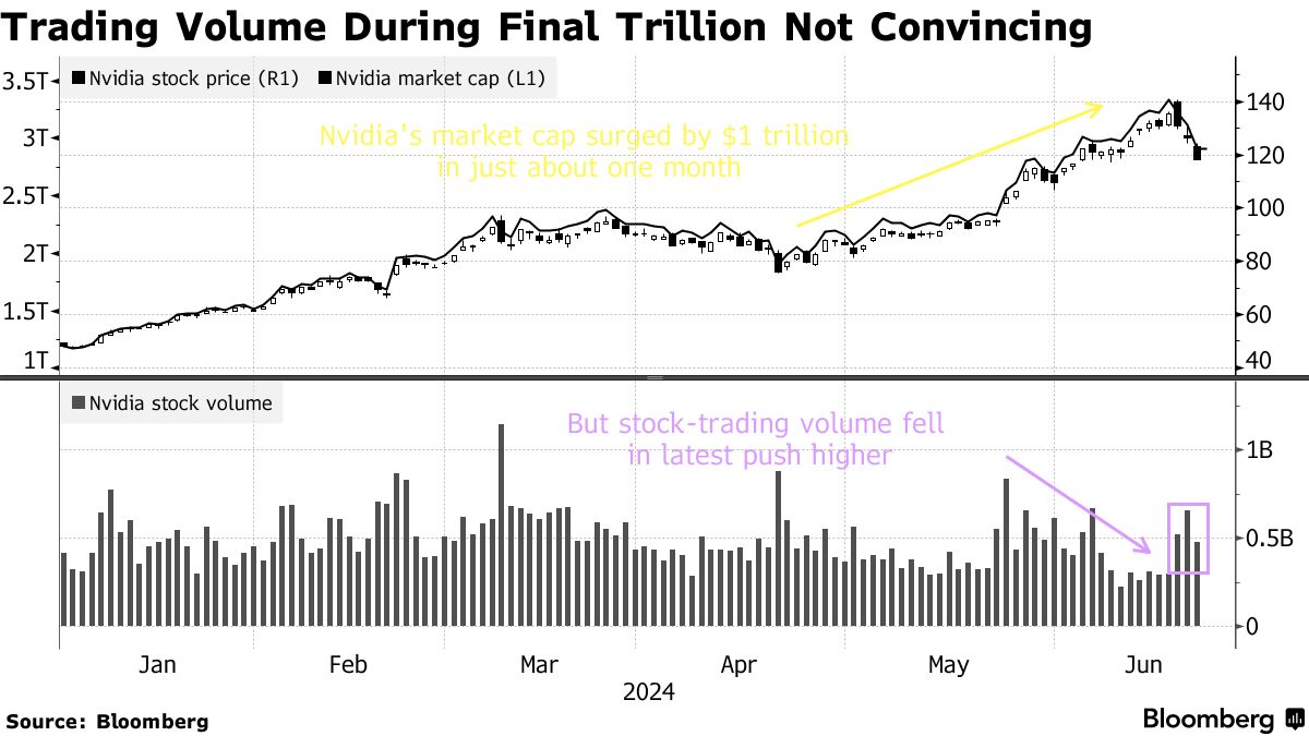 交易活动已经显示出对最新涨势缺乏信心。尽管Nvidia只用了大约一个月的时间,将其市值从2万亿美元提升到3万亿美元,但现金交易量下降了。到6月18日,当股价达到顶峰时,交易量已经从5月23日的高点下降了约三分之二。