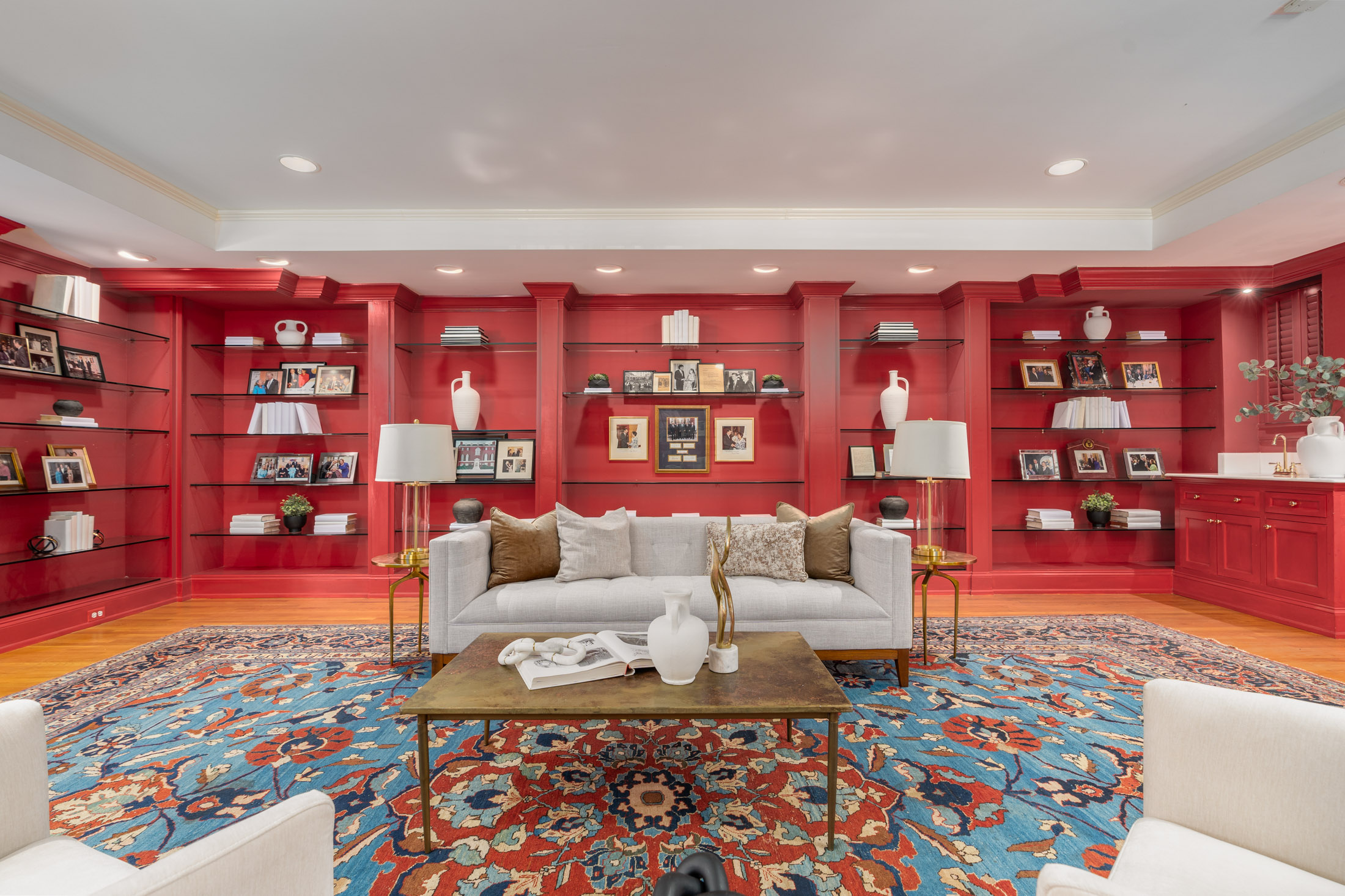 二楼有两个客厅。摄影师:肖恩·沙纳汉在那个二楼,法式门通向一个露台,通向后面的花园。