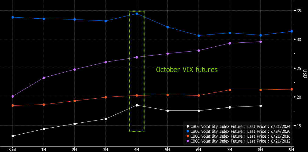 任何可能影响经济并扰乱市场的重大事件都可能导致交易波动。选举也不例外。芝加哥期权交易所波动率指数(VIX),也被称为华尔街的“恐惧指数”,的期货曲线显示,今年交易员已经开始为11月选举周围的股市波动风险做准备,这种立场通常是在一年后才会看到的。原因可能是在这个选举周期,选民比典型的选举年更早地对主要候选人有了一些清晰的认识。