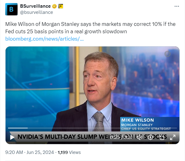 在他看来,增长冲击是真正、广泛修正的最可能催化剂。威尔逊表示,如果美联储在实际增长放缓时削减25个基点,股票可能会下跌10%。