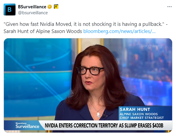 “考虑到英伟达的快速上涨,它出现一定程度的回调并不令人震惊,” Alpine Saxon Woods的Sarah Hunt表示。