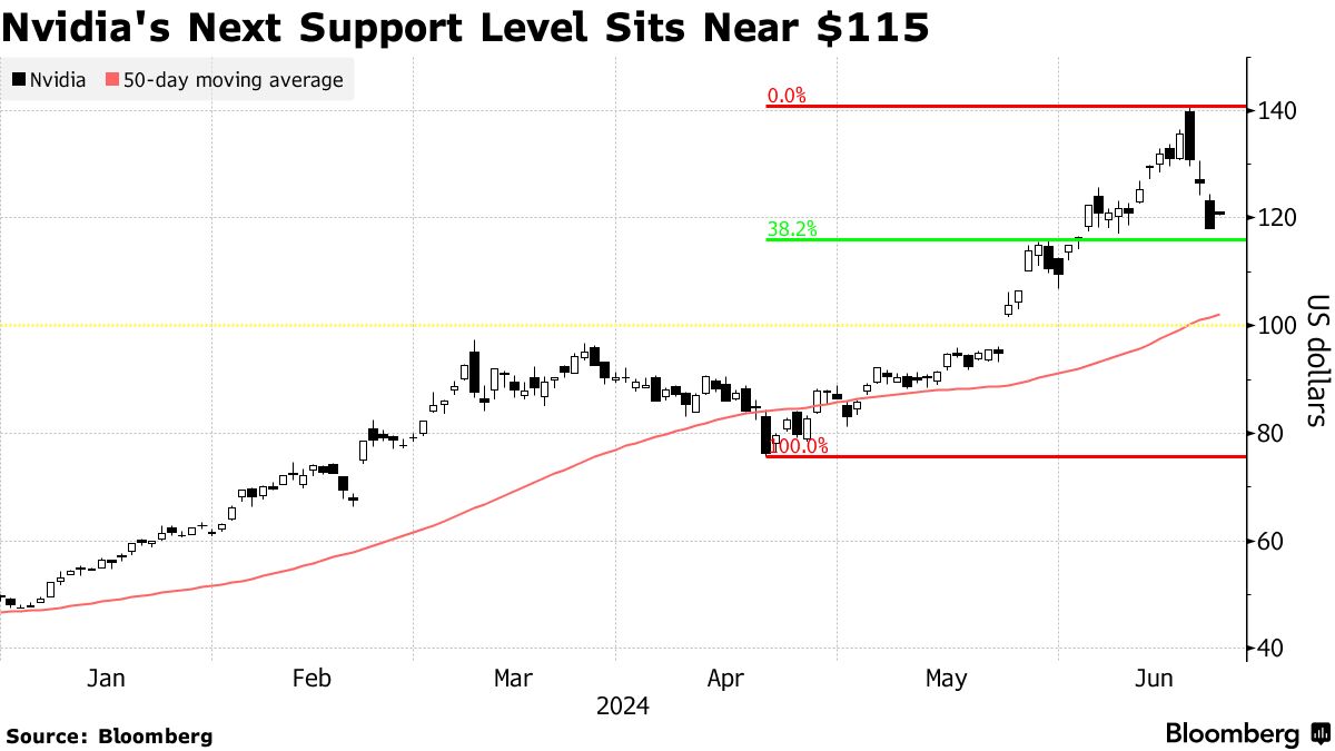 布夫·多米尔,Kingsview Partners的首席技术分析师,认为股价在115美元附近有短期支撑。这接近一个关键的斐波那契回撤水平,这是技术分析师用来确定股票和其他资产支撑或阻力线的工具。从四月份的盘中低点到上周的历史高点,38.2%的回撤水平比周一收盘价低约2%。
