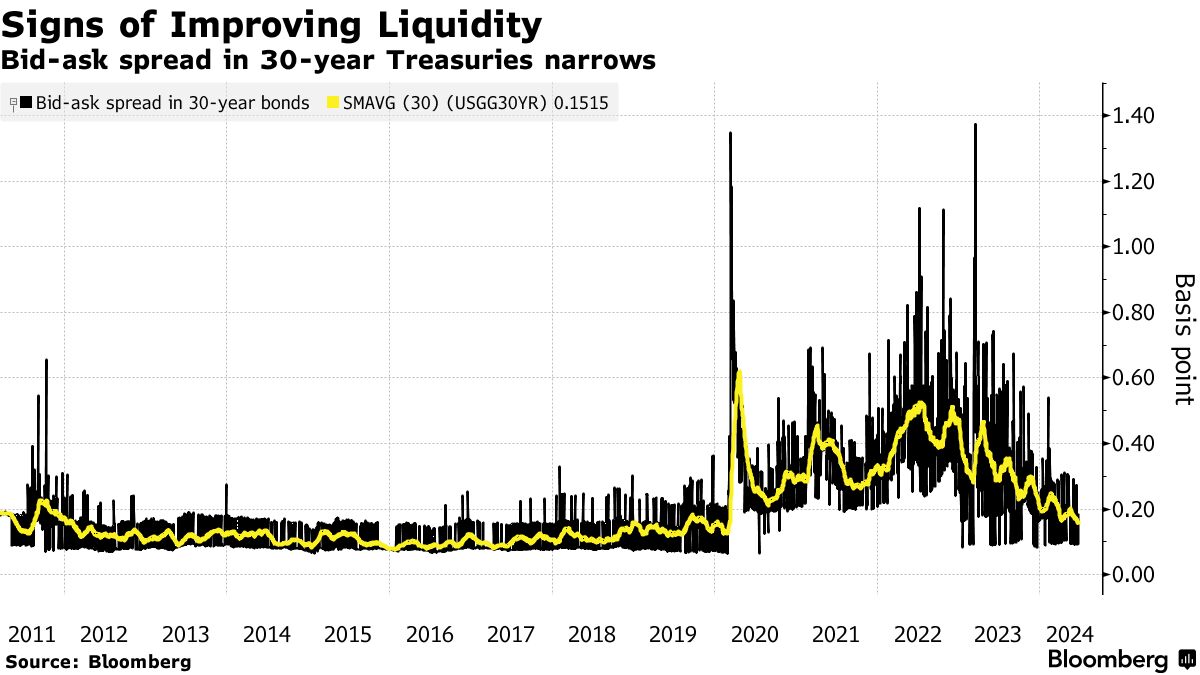 根据摩根大通首选的衡量标准,市场深度——基于交易员愿意以单一公布价格购买或出售的票据或债券数量——“在过去一年中稳步改善”,策略师们表示。该基准是根据在芝加哥商品交易所集团旗下的BrokerTec电子交易平台上公布的规模计算的,在2020年3月崩溃。