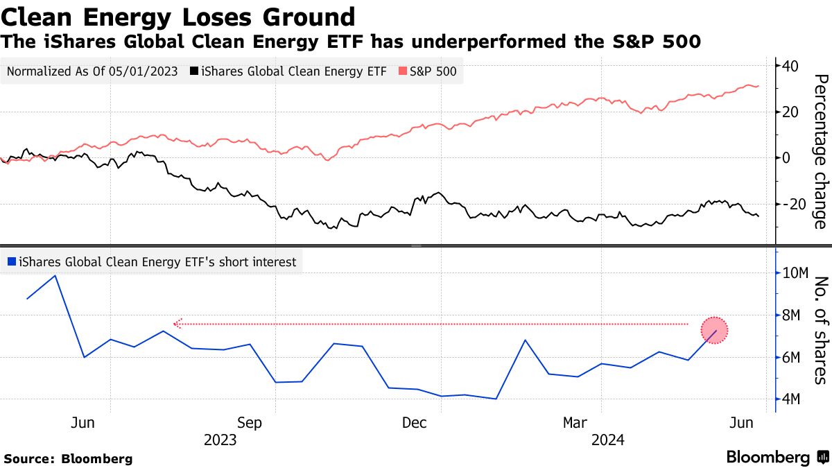 根据彭博社编制的做空数据显示,对价值22亿美元的iShares全球清洁能源交易所交易基金的押注已升至一年来的最高水平。投资者正在权衡绿色回击和长期较高利率。与标普500指数的26%涨幅相比,该交易所交易基金在过去12个月中下跌了超过22%。