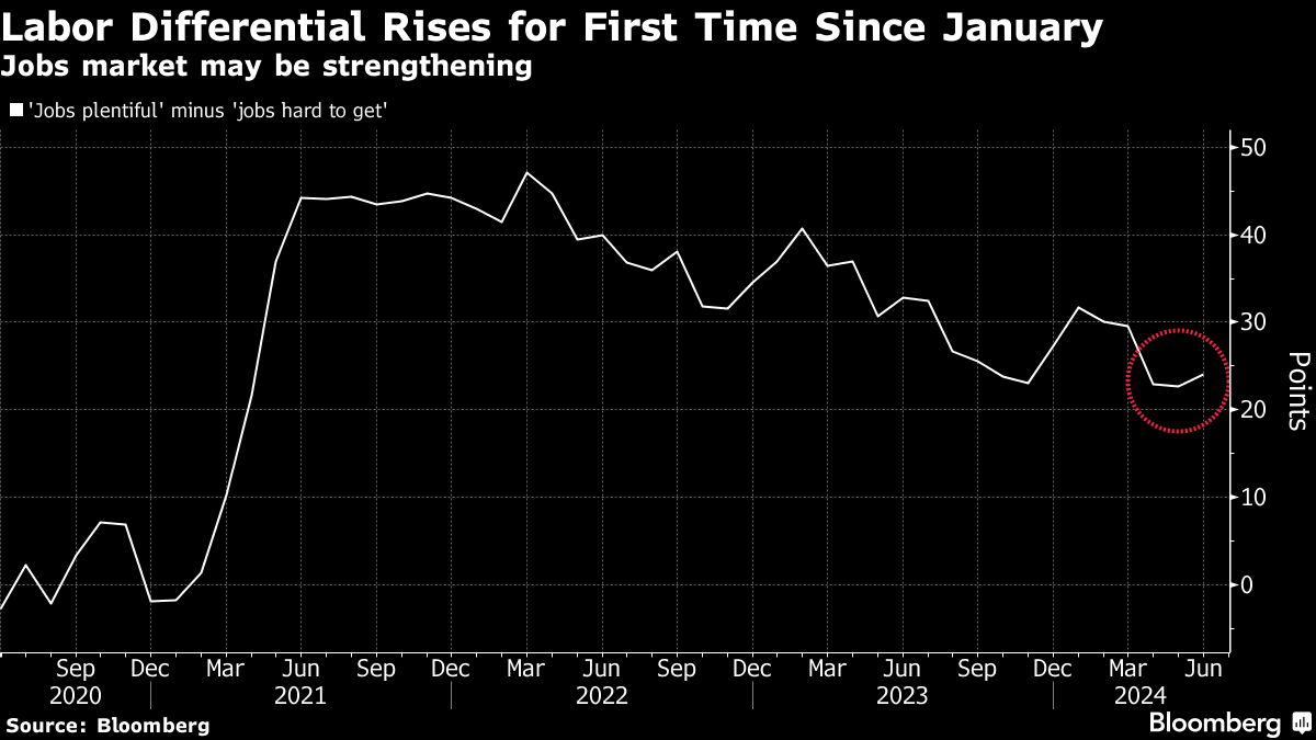根据最新一批消费者信心数据,消费者对当前劳动力市场的看法在6月份有所改善。有38.1%的消费者表示工作“充裕”,高于5月份的37%,而认为工作“难以获得”的人数减少。这两者之间的差异——这是经济学家密切关注的一个指标,用于衡量劳动力市场的强度——自年初以来首次上升。