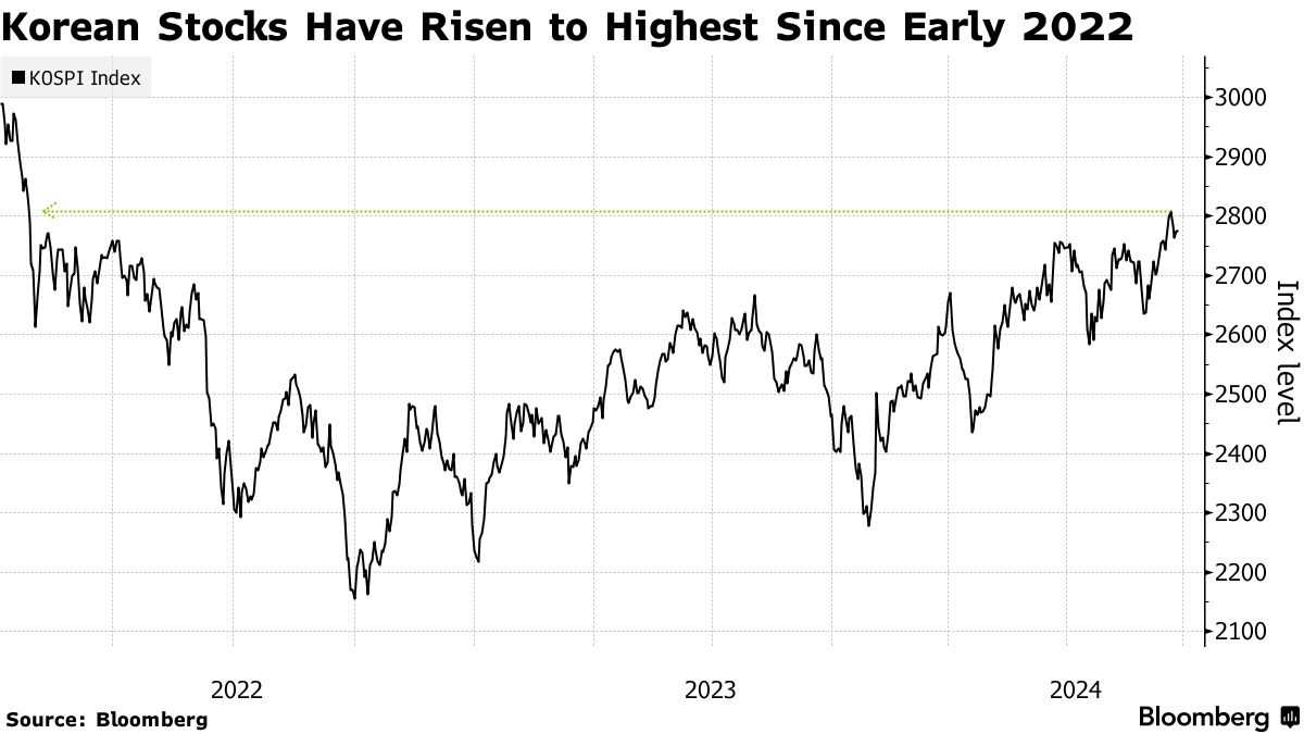 韩国综合指数已经飙升至自2022年初以来的最高水平,最近交易约在2,779点左右,人工智能的热情推动了三星电子和SK海力士等芯片制造商的股价上涨。指导方针监管机构发布的指导方针,指导公司如何增加股东回报并改善公司治理,也有助于提振低迷的估值,投资者表示。