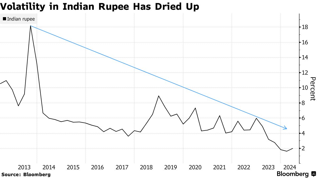 摄影师:Indranil Aditya/Bloomberg在过去十年中,印度卢比已经从亚洲最波动的货币之一变成了最稳定的货币之一。这一转变反映了印度日益增长的经济实力以及央行干预管理卢比波动的举措。随着印度债券本周将加入一个重要的全球指数,卢比的稳定性来得正是时候,增加了印度资产对投资者的吸引力。过多的波动会增加企业和投资者的成本,使其难以应对。以下是卢比命运如何发生转变的更深入探讨:
