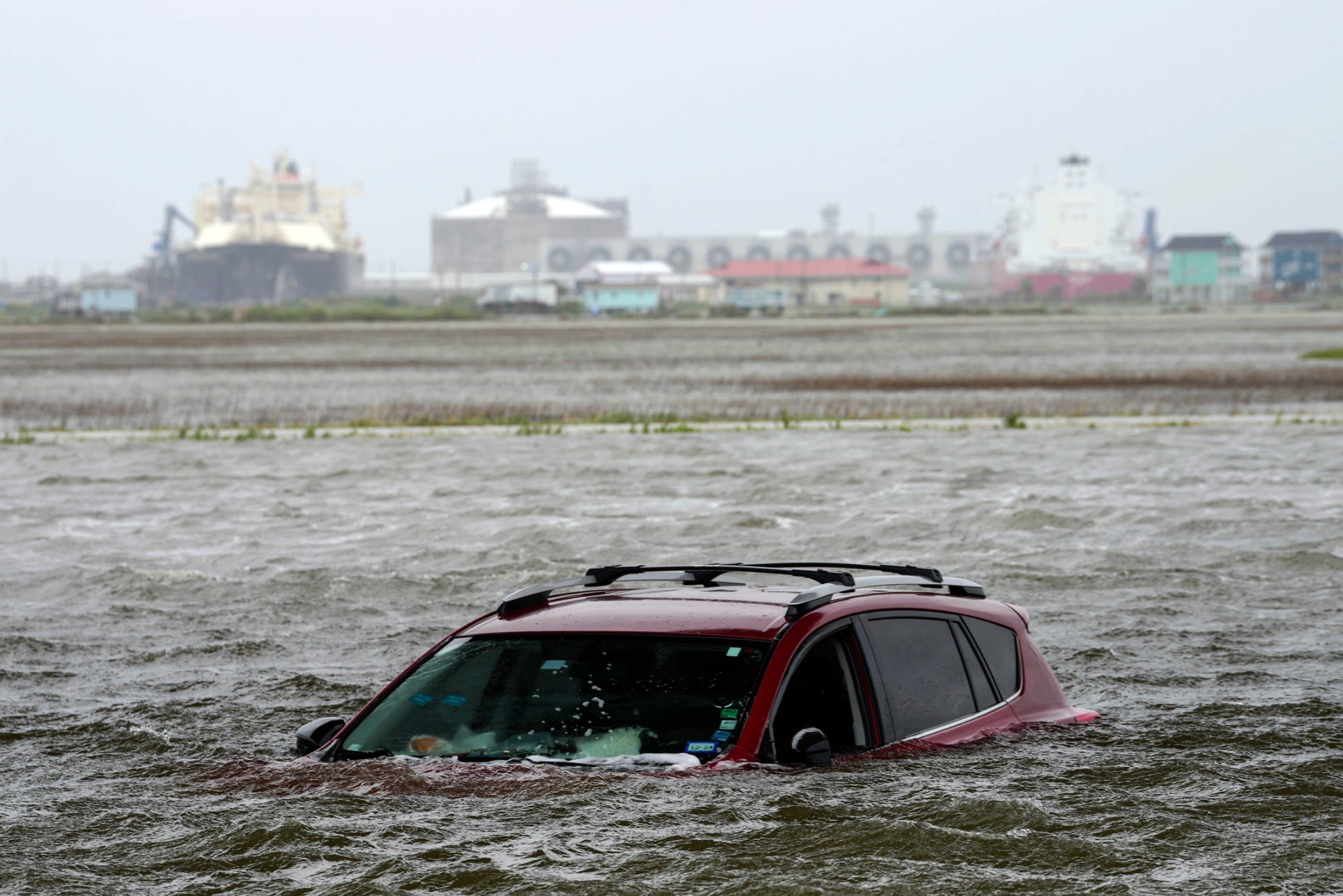 一辆汽车被淹没在德克萨斯州沙滩市的水中,当时热带风暴阿尔贝托正接近陆地,时间是6月19日。