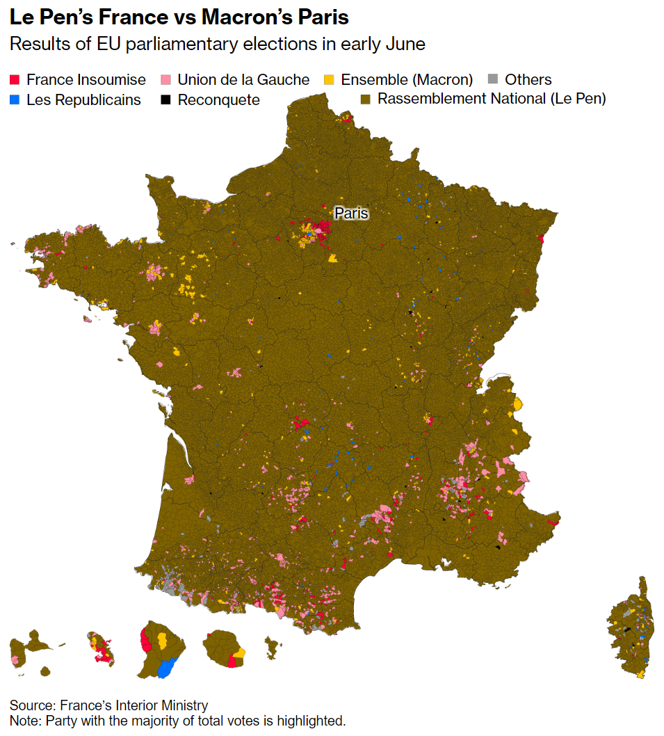要衡量一场大胜极右翼国民集会可能会取得的胜利有多大,只需看一下欧洲选举结果的地图,Lionel Laurent写道。它们可能表明一条通往比所有其他政党加起来还要大的绝对多数的道路。