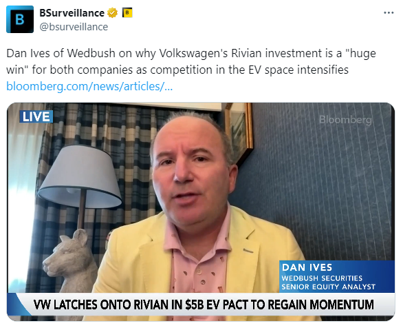 Wedbush的丹·艾夫斯称大众汽车公司对Rivian Automotive Inc.的投资是“双赢”。
