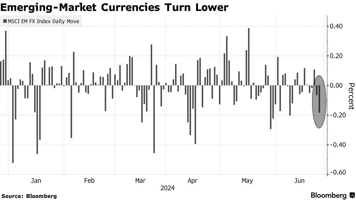 欧洲政治也让风险承担者感到不安。玛丽娜·勒庞的国民集会在法国即将开始的议会选举中排名第一,引发投资者的焦虑,这也影响了欧盟东部地区。波兰兹罗提和捷克克朗也表现不佳。