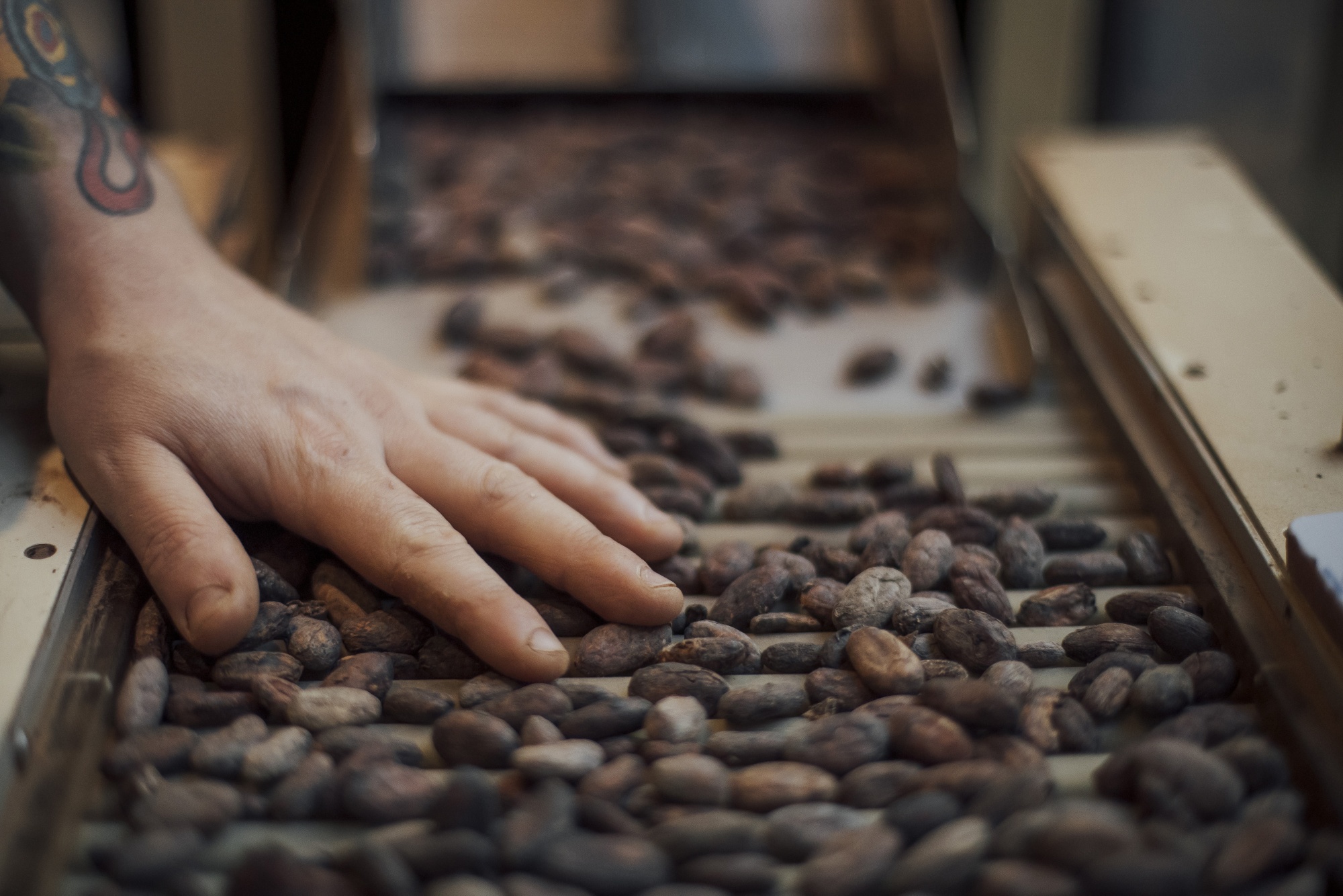 一名员工在法国巴黎的一家巧克力工厂准备可可豆进行烘烤。