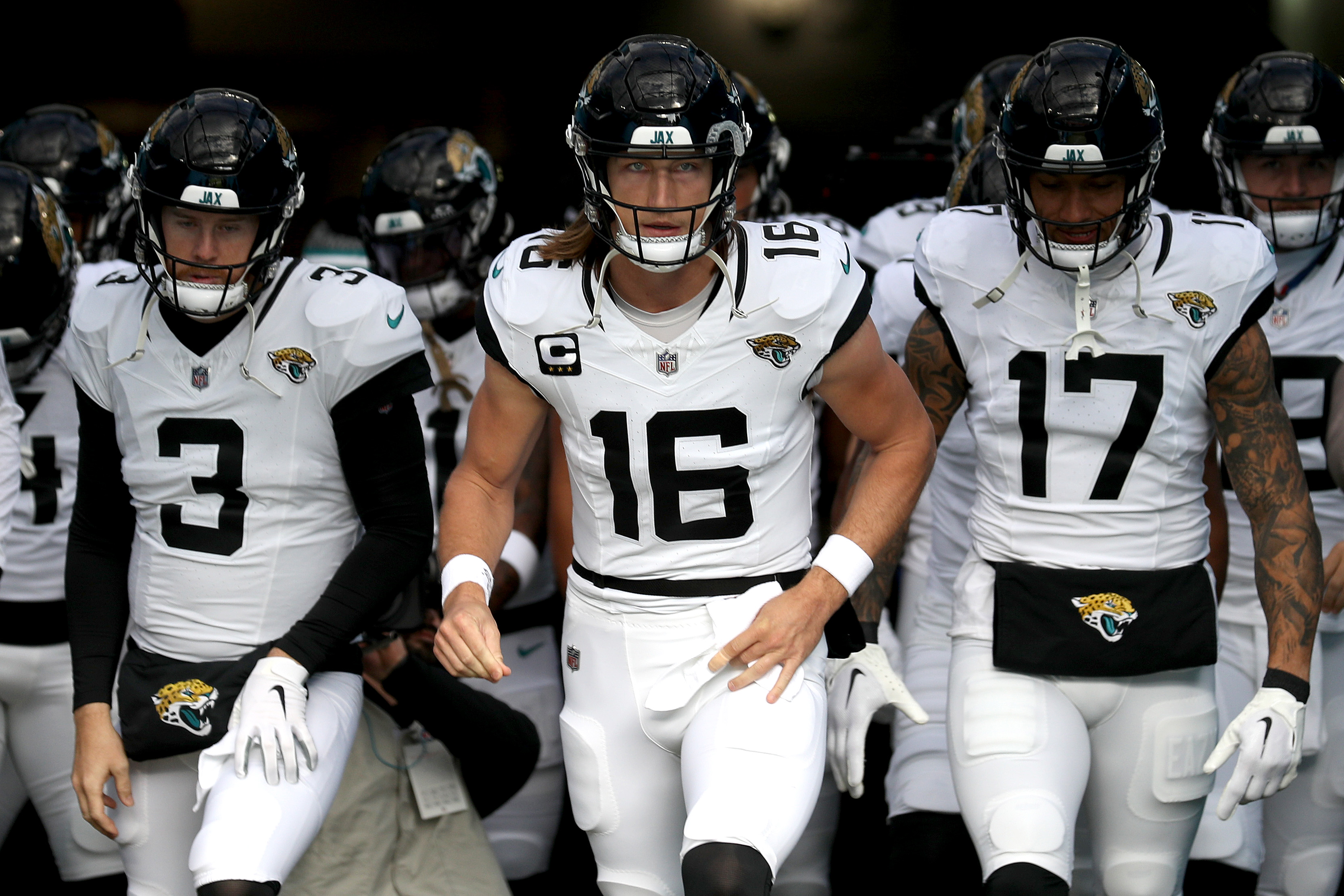 杰克逊维尔美洲虎在比赛前跑上球场。