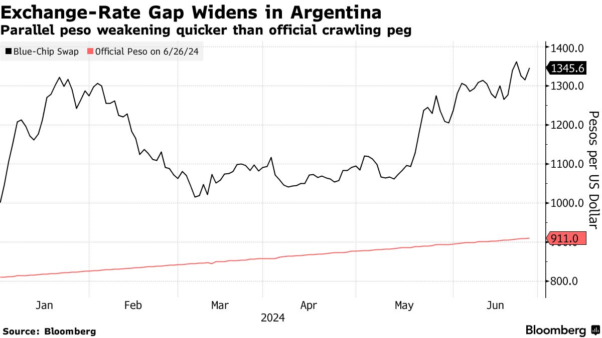 阿根廷官员控制着官方比索汇率,目前约为每美元911比索,并表示他们计划保持每月2%的贬值速度,即所谓的爬行固定汇率,以及其他货币措施。投资者认为这种固定汇率是不可持续的,因为它落后于通货膨胀。