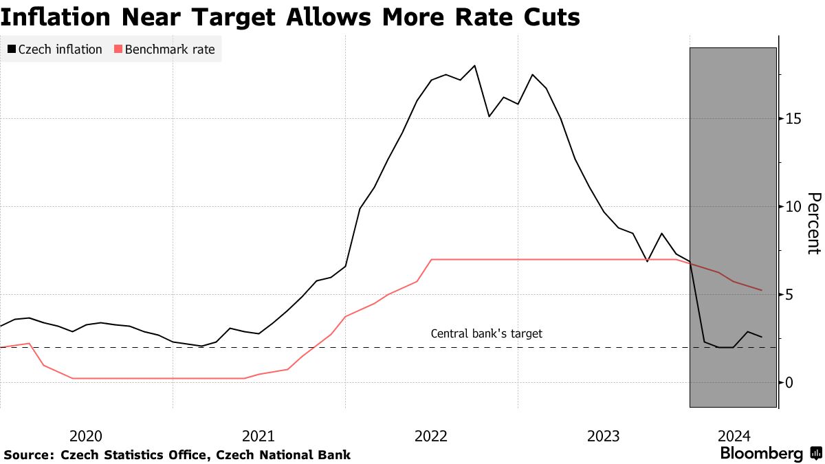 投资者最近已经减少了对今年降息幅度的押注,部分原因是对欧洲央行和美联储更加鹰派的展望。捷克货币市场价格现在暗示12月份基准利率约为4%。