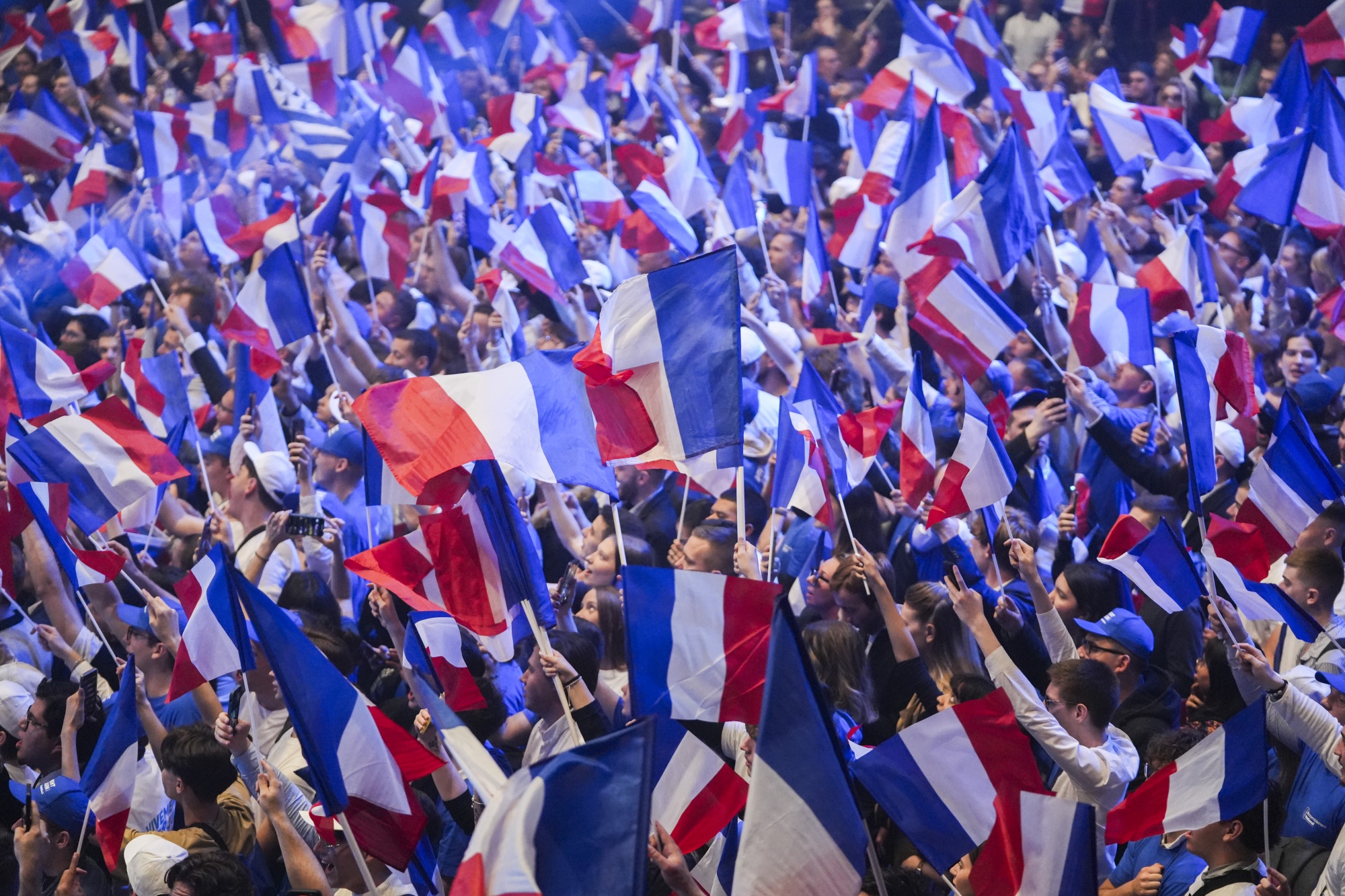 在巴黎国民集会活动中挥舞法国国旗的支持者。摄影师:Nathan Laine/Bloomberg
