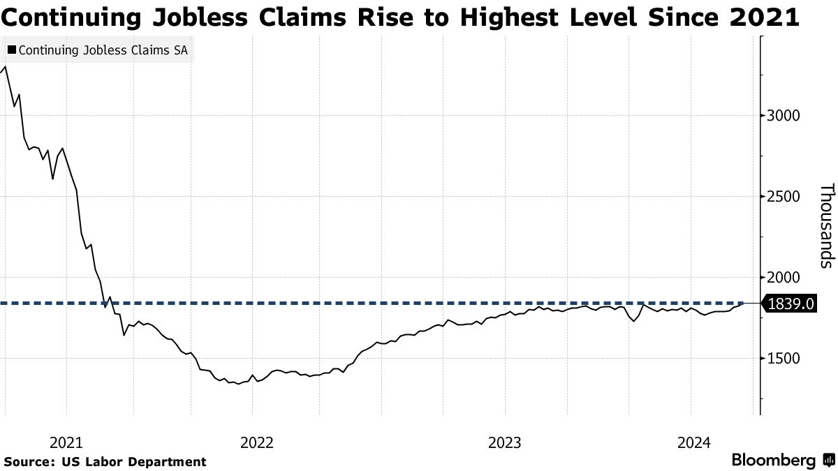 自大流行病复苏时期普遍存在劳动力短缺以来,招聘已经显著放缓,上个月失业率首次在两年内上升至4%。经济学家和美联储决策者正在关注索赔数据,以了解劳动力市场是否继续走软,迄今为止,该市场一直表现出令人意外的韧性。
