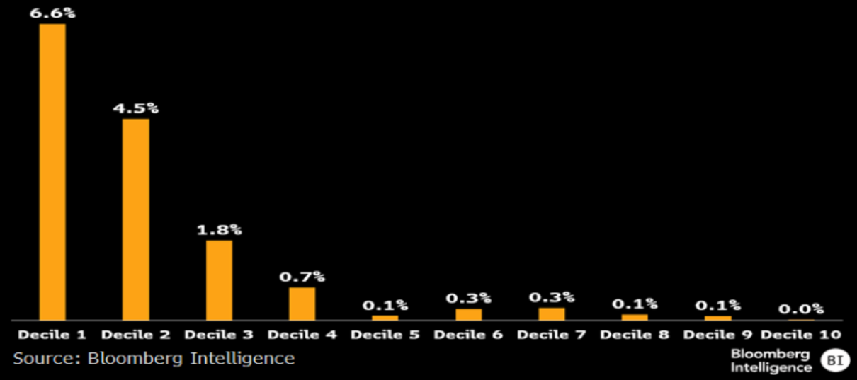 那些没有持有英伟达股票的人已经被甩在了后面。根据BI的Athanasios Psarofagis的数据,拥有与这家人工智能领域的开拓者有关的投资已成为表现最佳的ETF的“主要推动因素”,在英伟达去年首次爆发以来的数据中,排名前十分位的ETF平均权重接近7%。而表现最差的十分位几乎没有与该公司有关的投资。