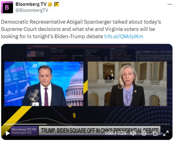 今天在彭博电视台的权力平衡早间版节目中,主持人乔·马修和凯利·莱因兹采访了民主党众议员阿比盖尔·斯潘伯格,谈论了今天最高法院的裁决,以及她和弗吉尼亚选民今晚在拜登-特朗普辩论中将关注的问题。