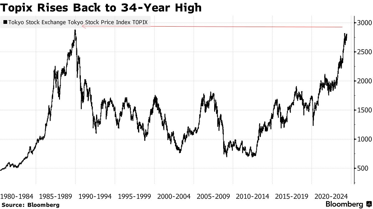 该国最广泛的股票指数攀升至2816.62点,高于3月22日的峰值,即将创下自1990年1月以来的最高收盘价。这使其距离创纪录的最高点仅有约2.5%的距离,而蓝筹公司的日经225指数今年早些时候已经达到了这一里程碑。