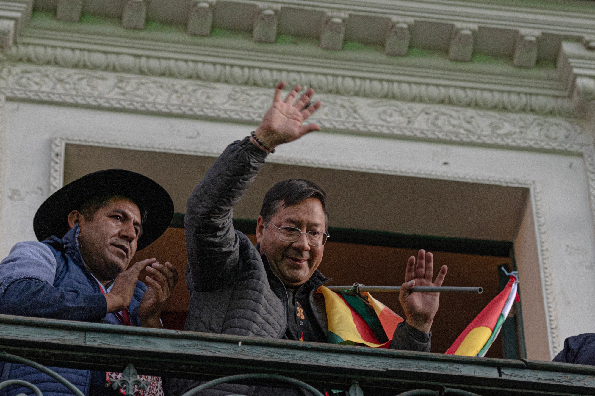Luis Arce从周三在拉巴斯的Palacio Quemado的阳台上挥手。摄影师:Marcelo Perez del Carpio/Bloomberg