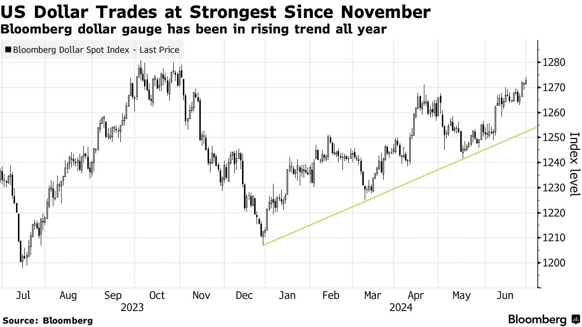 美元强势指数在周五上涨了多达0.2%,随后略有回落,美元正朝着第六个连续周涨势迈进。总统乔·拜登在辩论的早期交流中出现失误,这种表现可能加剧人们对他在11月选举中击败特朗普的担忧。