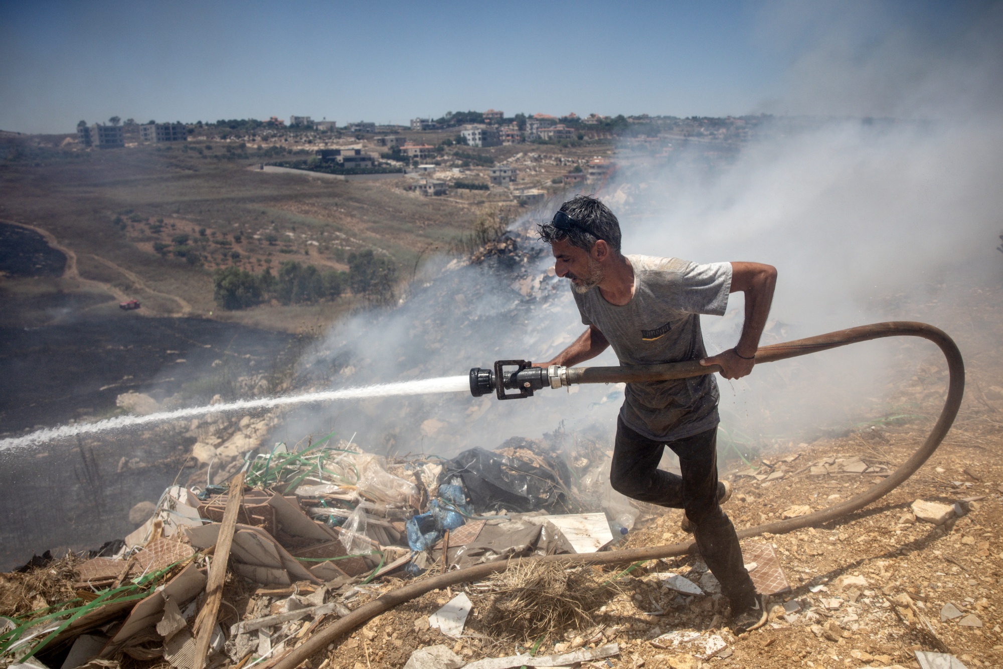 一名平民试图扑灭黎巴嫩宾特杰贝尔地区以色列空袭引起的火灾,时间为6月26日。