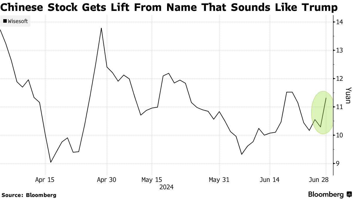 Wisesoft Co.,其中文名“传达至胜”听起来像普通话讲话者说的“特朗普大获全胜”,周五在深圳暴涨10%。随着拜登总统在亚特兰大与共和党候选人唐纳德·特朗普的交流中出现犹豫,该股票上涨。
