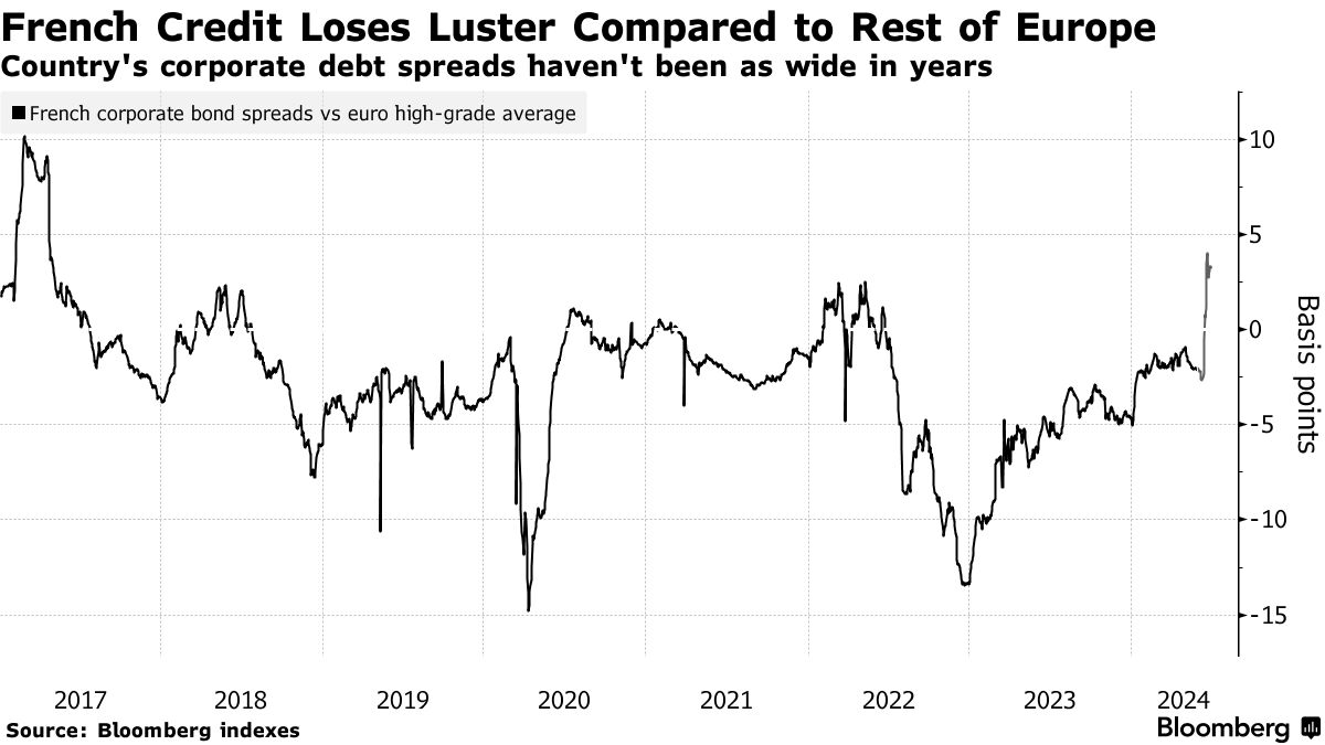 在信贷市场上,法国公司相对于其欧元区同行的借款风险溢价已经飙升至2017年选举前的最高水平。在临时选举被宣布之前,这一成本一直保持较低。