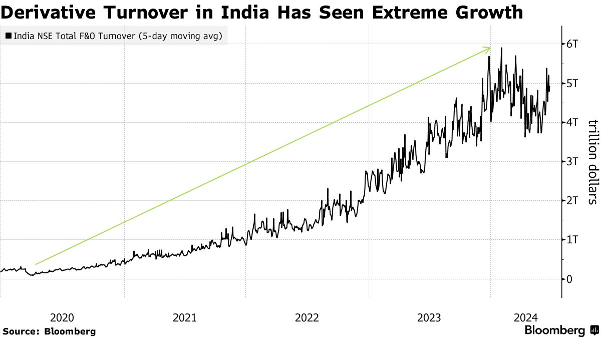 当局已多次提出对股票衍生品繁荣的担忧。由于数百万散户投资者的参与,期货和期权交易的名义成交额在2月初达到了6万亿美元,自2022年初以来增长了六倍。