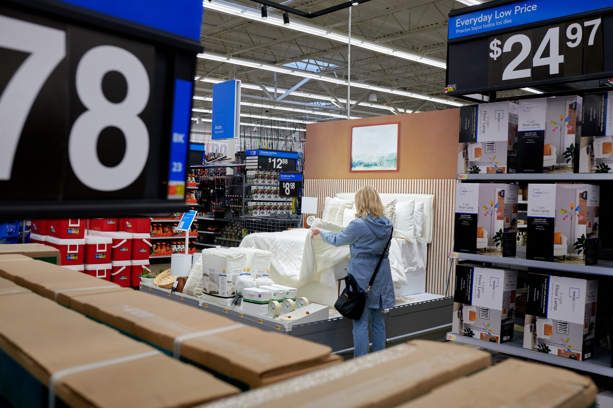 一个顾客在新泽西州塞考克斯的一家商店里查看展示的床单。