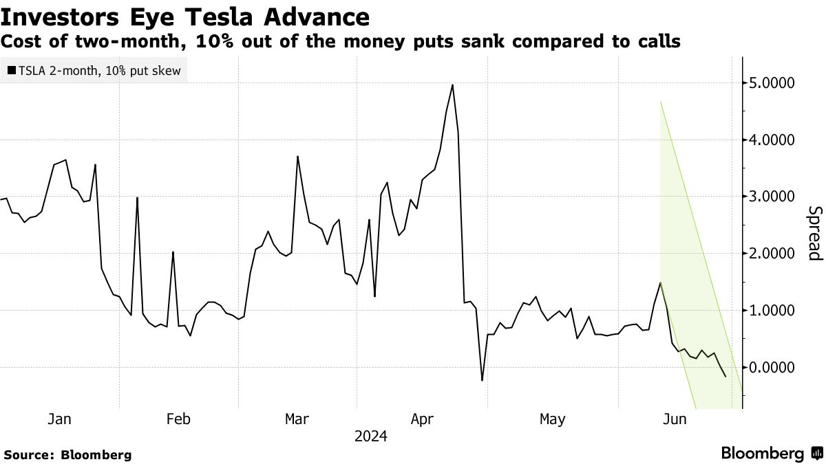 交易员对特斯拉股价可能在夏末时找到的位置持越来越乐观的态度。期权交易员已经提高了看涨期权的价格,这些期权预期在两个月内上涨10%,相对于等值看跌期权的价格。这种动态信号表明人们对追逐股价上涨的兴趣正在增加,同时对对冲下跌的愿望正在减弱。
