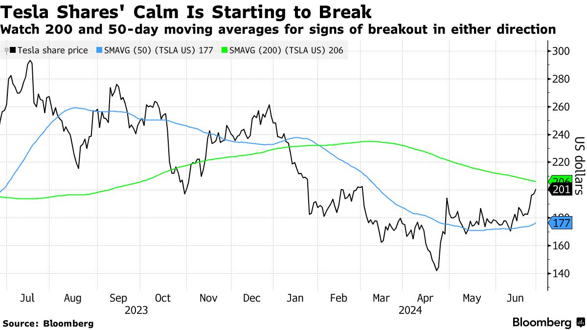 自5月初以来,特斯拉股票一直在一个相当狭窄的范围内交易,而在年初曾有过剧烈波动。股价仍低于其200日移动平均线——这是交易员密切关注的长期趋势指标——但本周的大幅上涨表明可能会有变化。