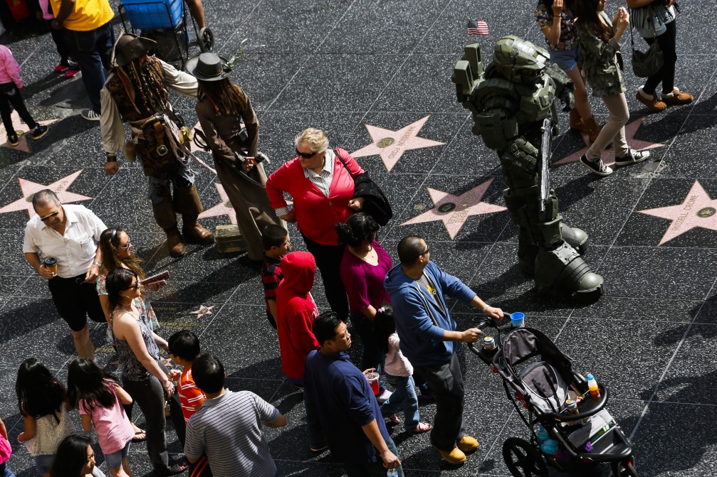 好莱坞大道的游客和穿着戏装的街头表演者在星光大道上。当地倡导者表示,这条街道可能受游客欢迎,但已经到了需要改头换面的时候。