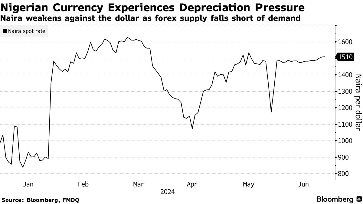 尼日利亚多年来一直面临着严重的外汇短缺和不稳定,这是由于原油产量下降和经济多样化不足所导致的。自2023年6月尼日利亚总统博拉·提努布政府推出政策变革以吸引资金流入帮助振兴经济以来,当地货币兑美元已贬值约70%。