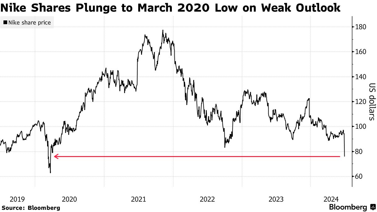 耐克公司股价周五暴跌,创下2001年2月以来的最大跌幅,此前该公司报告季度收入低于预期,并预测本财年销售额意外下降。这次股市暴跌将使耐克市值蒸发大约270亿美元,至少有七家彭博跟踪的分析师在更新后下调了对该公司股票的评级。