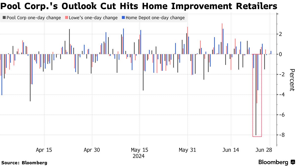 本周伊始,游泳池用品分销商Pool Corp.调低了全年利润预期,称新游泳池建设需求“持续疲弱”。该公司指出,消费者对游泳池和户外生活项目等大件商品的谨慎消费。其股价在随后的交易中出现自2022年7月以来最大跌幅,这一警告对家居改善零售商家得宝公司和Lowe’s公司产生了影响。