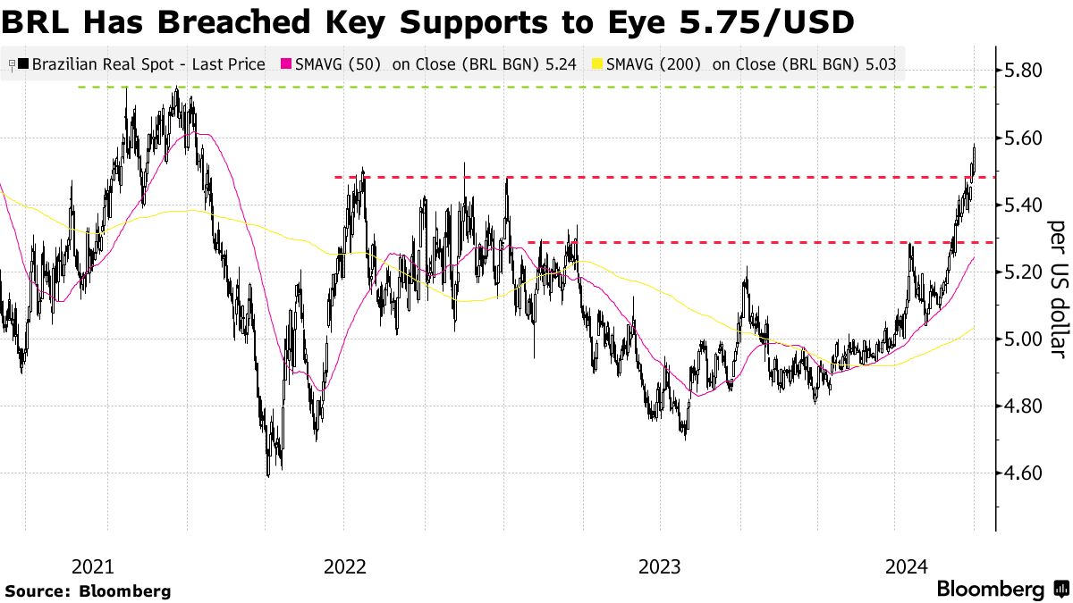 雷亚尔的迅速贬值使央行警惕起来。货币政策总监加布里埃尔·加利波洛在周五下午的活动中表示,决策者正在监控其与同行的表现,以判断这是否表明投资者对巴西的风险厌恶情绪增加。
