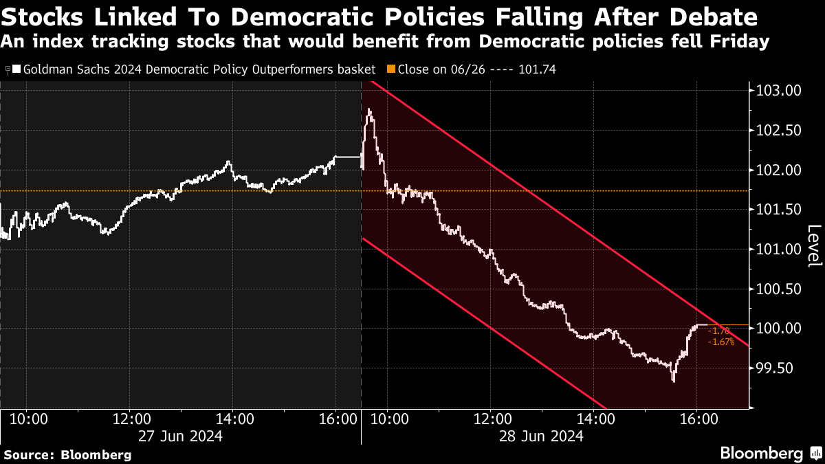 拜登在亚特兰大与特朗普辩论。摄影师:埃娃·玛丽·乌兹卡特吉/彭博社各个领域的股票交易员正在重新调整他们的头寸,以适应备受期待的总统辩论之后的局势,该辩论是由现任总统乔·拜登和前总统唐纳德·特朗普之间展开的。