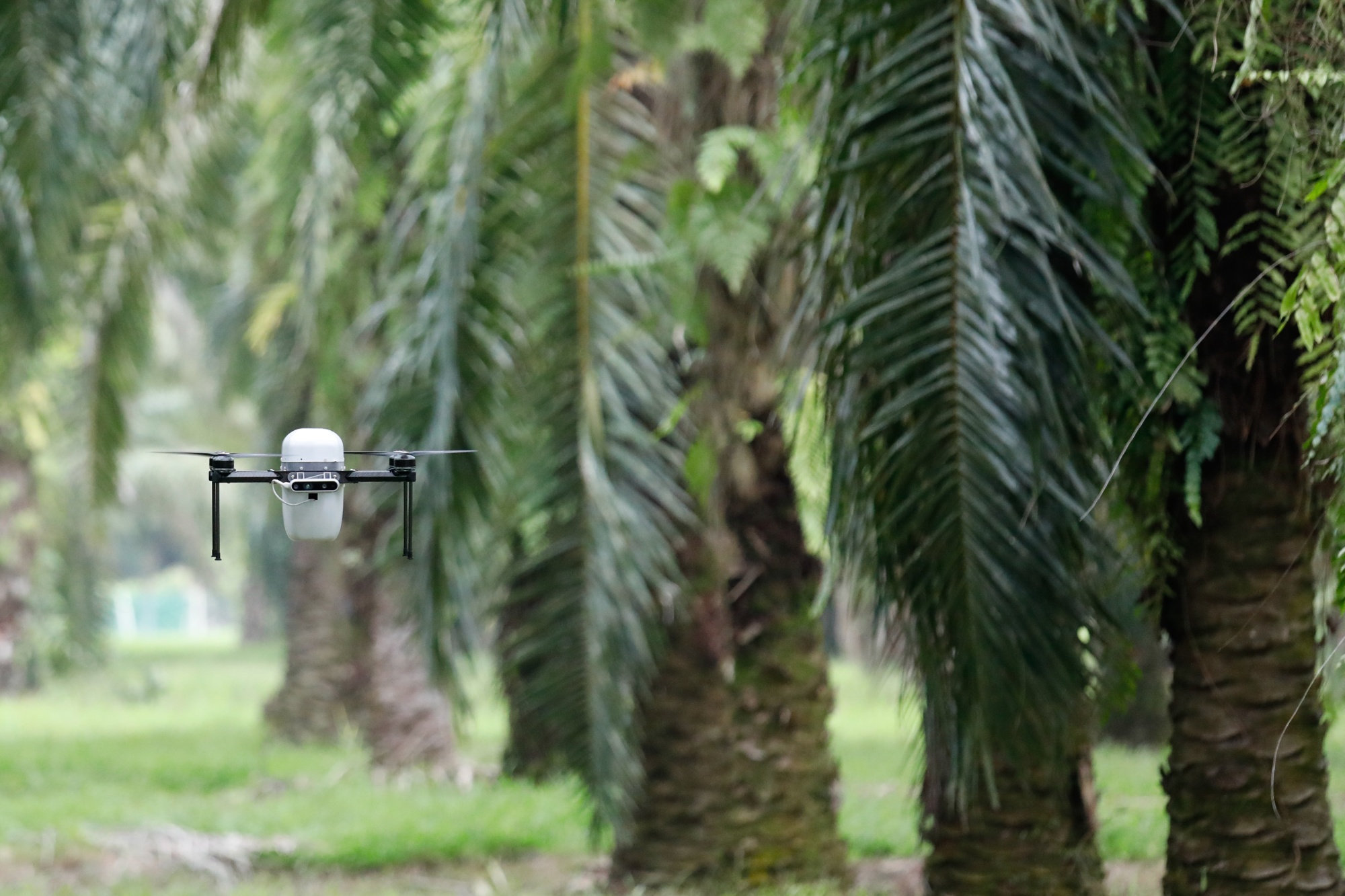 在一个潮湿的马来西亚早晨,一架无人机在树木间嗡嗡作响,监视着油棕果实的成熟情况。自动驾驶卡车在广阔的种植园不平整的地面上隆隆作响,施肥并收集密集的收割成束的果穗。