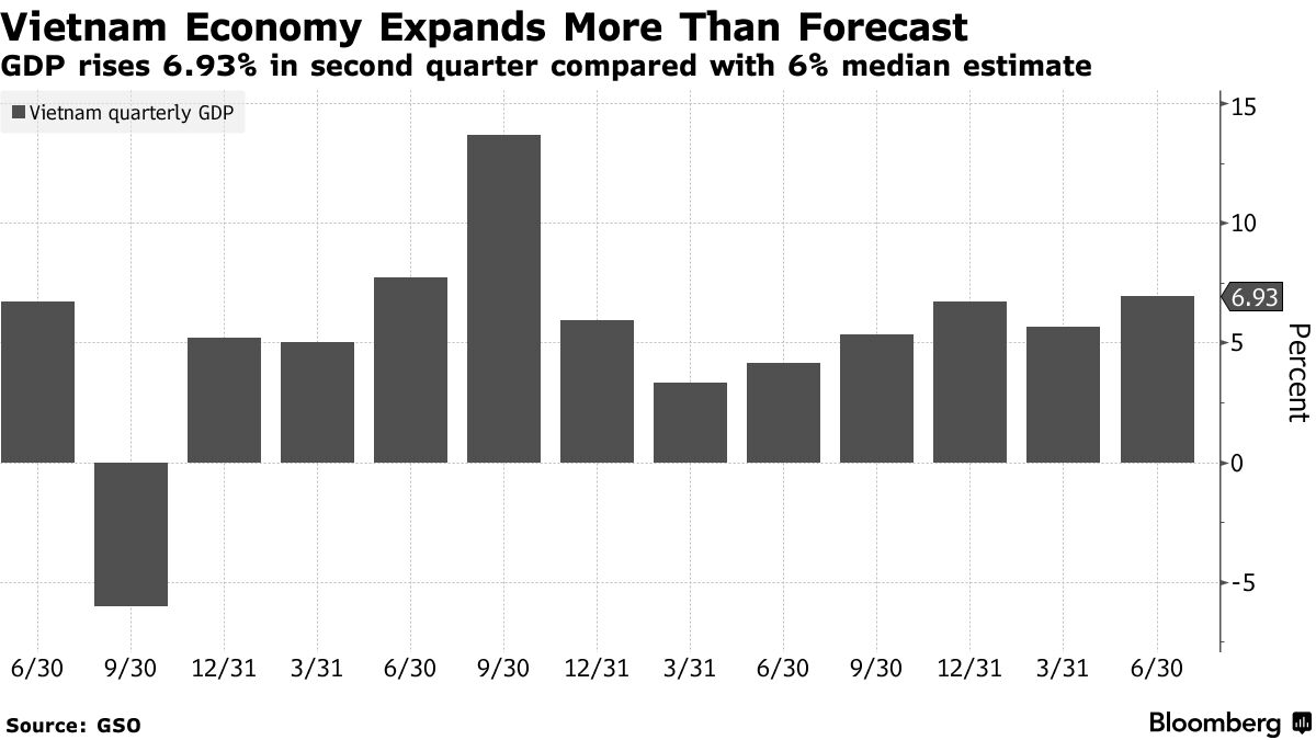 根据周六河内的统计总局的数据,4月至6月期间,国内生产总值比去年同期增长了6.93%。这比彭博社调查的分析师中值估计的6%要快,也比第一季度修正后的5.87%扩张要快。