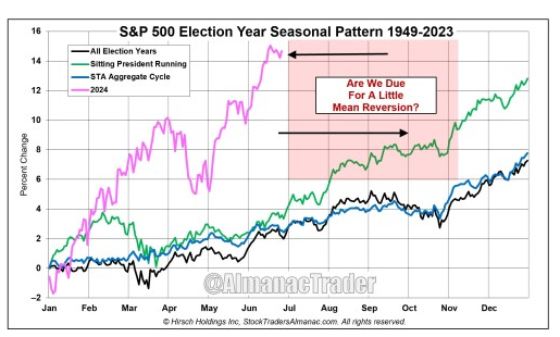 尽管美国总统选举年上半年市场历史上较弱,但根据Ned Davis Research的数据,这是自1928年以来第二好的1月至6月表现。随着股市打破季节性规律,根据《股票交易员年鉴》编辑杰弗里·赫希的预测,股市有可能在未来几周内回调5%至8%,他在2008年全球金融危机后准确预测了股市的反弹。